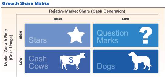 The matrix categorises business units as “stars,” “cash cows,” “dogs,” and “question marks,” depending on whether they deserve cash infusions or need to be closed down.
